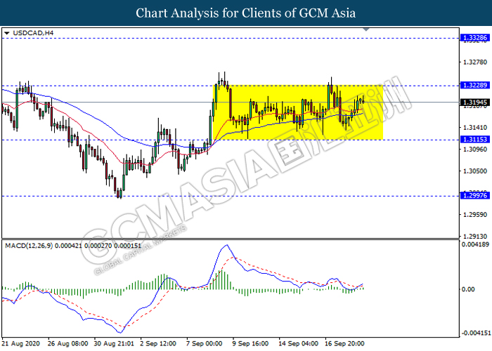 USDCAD, H4: USDCAD remain traded in a sideway channel. However, MACD which illustrate bullish bias signal with the formation of golden cross suggest the pair to be traded higher in short term towards the resistance level 1.3230.