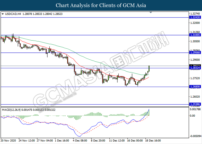 USDCAD, H4: USDCAD was traded higher while currently testing the resistance level 1.2830. MACD which illustrate ongoing bullish momentum signal suggest the pair to extend it gains after it breaks above the resistance level.