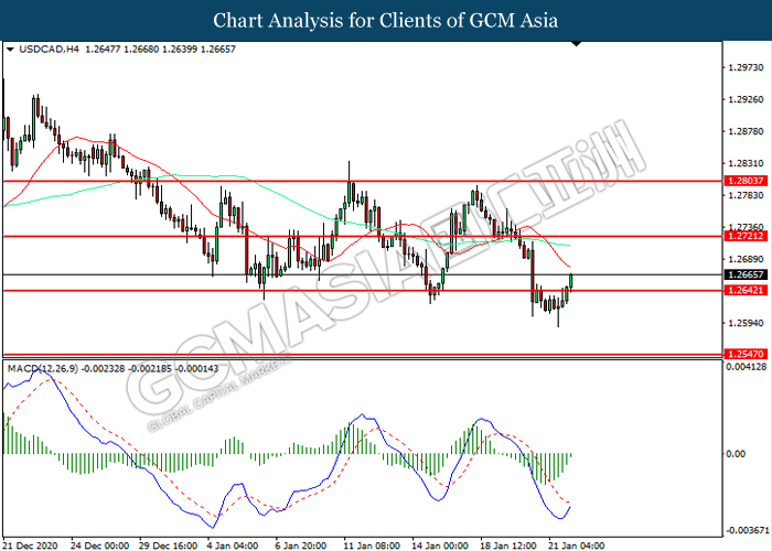 USDCAD, H4: USDCAD was traded higher following prior rebound from the support level at 1.2640. MACD which illustrated diminishing bearish momentum suggest the pair to extend its gains toward resistance level at 1.2720.