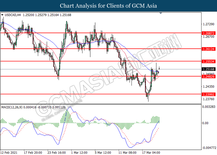 USDCAD, H4: USDCAD was traded higher following prior rebound from the support level at 1.2485. MACD which illustrate bullish bias momentum signal suggest the pair to extend its gains toward the resistance level at 1.2555.