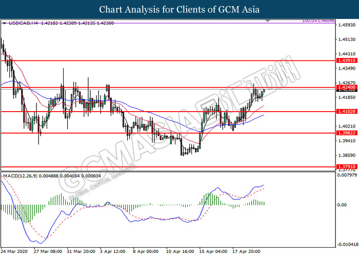 USDCAD, H4: USDCAD was traded higher while currently testing the resistance level at 1.4240. MACD which illustrate bullish bias momentum suggest the pair to extend its gains after it successfully breakout above the resistance level at 1.4240.