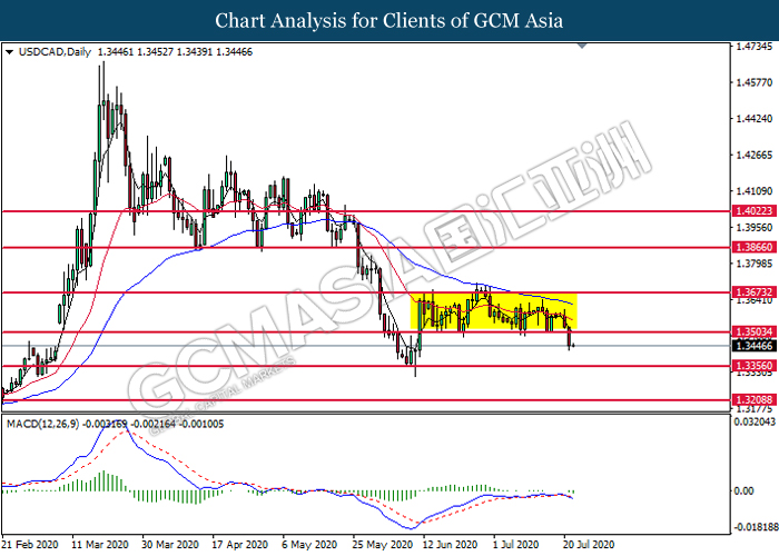 USDCAD, Daily: USDCAD was traded lower following prior breakout below the previous support level at 1.3505. MACD which illustrate bearish bias momentum signal suggest the pair to extend its losses toward the support level at 1.3355.