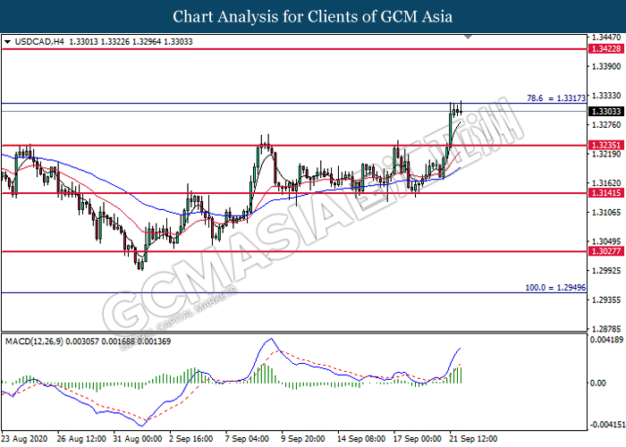 USDCAD, H4: USDCAD was traded higher while currently testing the resistance level at 1.3315. MACD which illustrate bullish bias momentum suggest the pair to extend its gains after it successfully breakout above the resistance level at 1.3315.