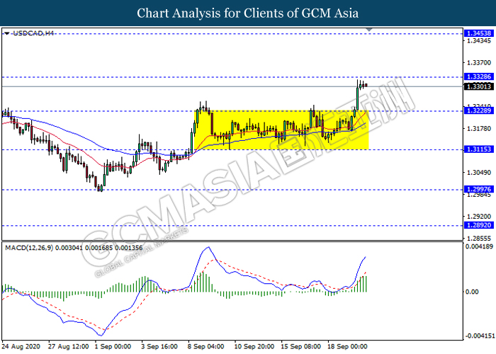 USDCAD, H4: USDCAD was traded higher while currently testing near the resistance level 1.3330. MACD which display ongoing bullish momentum suggest the pair to be traded higher after it breaks above the resistance level.