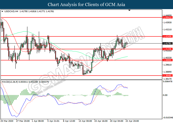 USDCAD, H4: USDCAD was traded higher following prior rebound from the support level at 1.4120. However, MACD which illustrated increasing bearish momentum suggest the pair to be traded lower in short-term as technical correction.