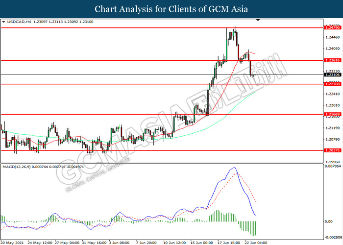 USDCAD, H4: USDCAD was traded lower following prior breakout below the previous support level at 1.2360. MACD which illustrated increasing bearish momentum suggest the pair to extend its losses toward support level at 1.2275.