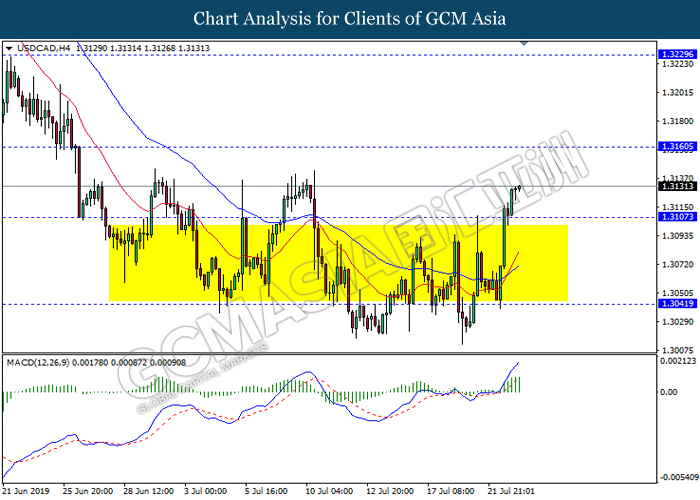 USDCAD, H4: USDCAD was traded higher following prior breakout above the previous resistance level 1.3105. MACD which illustrate bullish momentum signal suggest the pair to extend it gains towards the resistance level 1.3160.