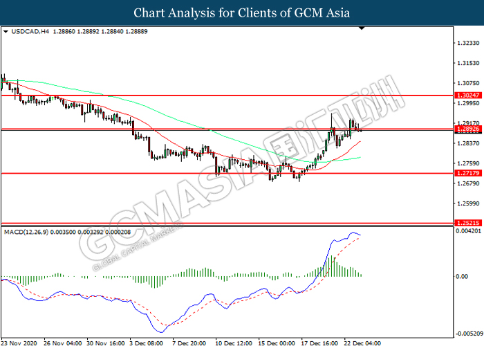 USDCAD, H4: USDCAD was traded lower following prior retracement from the resistance level at 1.2895. MACD which illustrated diminishing bullish momentum suggest the pair to extend its losses toward support level at 1.2720.