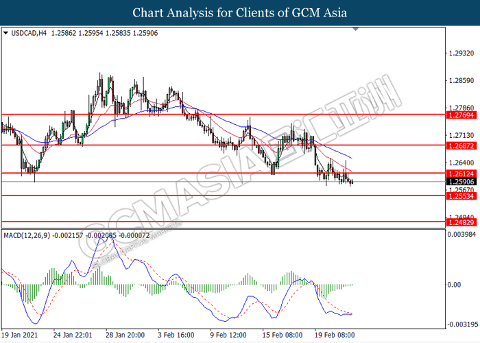 USDCAD, H4: USDCAD was traded lower following prior breakout below the previous support level at 1.2615. However, MACD which illustrate diminishing bearish momentum signal suggest the pair to undergo technical correction in short term.