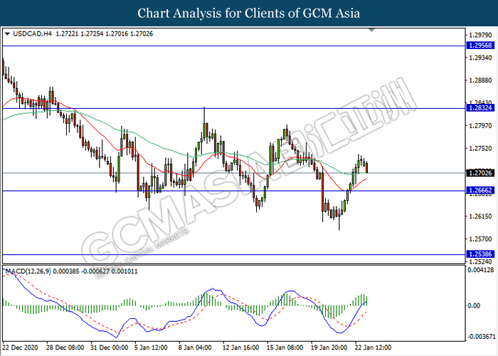 USDCAD, H4: USDCAD was traded lower following prior retracement from its high level. MACD which illustrate diminishing bullish momentum signal suggest the pair to extend its retracement in short term towards the support level 1.2665.