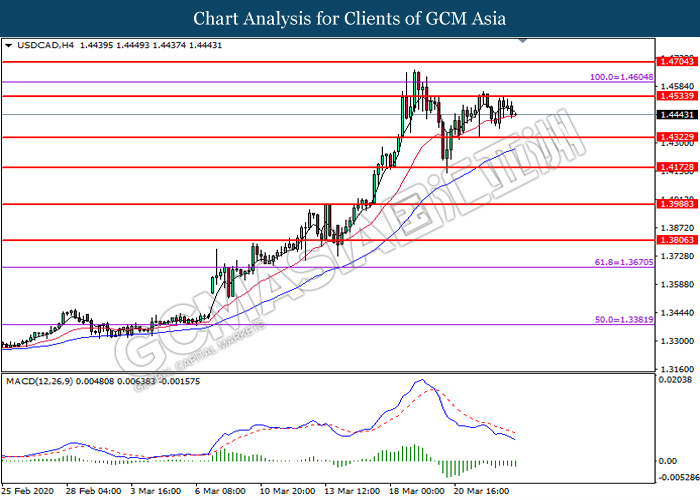 USDCAD, H4: USDCAD was traded lower following prior retracement from the resistance level at 1.4535. MACD which illustrate bearish momentum signal suggest the pair to extend its losses toward the support level at 1.4325.