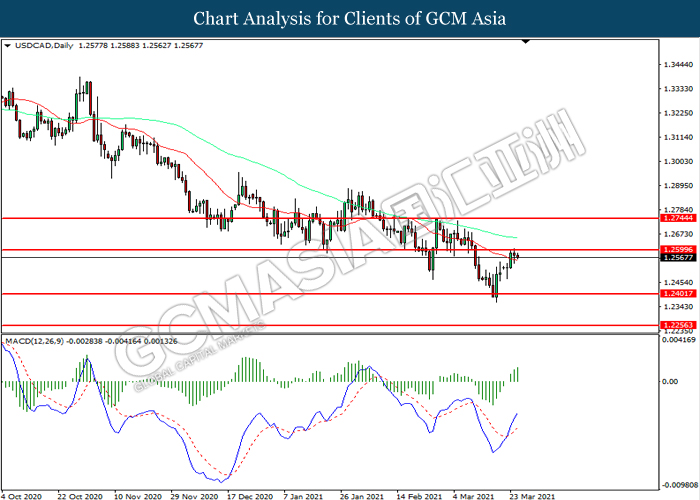 USDCAD, Daily: USDCAD was traded higher while currently testing the resistance level at 1.2600. MACD which illustrated increasing bullish momentum suggest the pair to extend its gains after it successfully breakout above the resistance level.