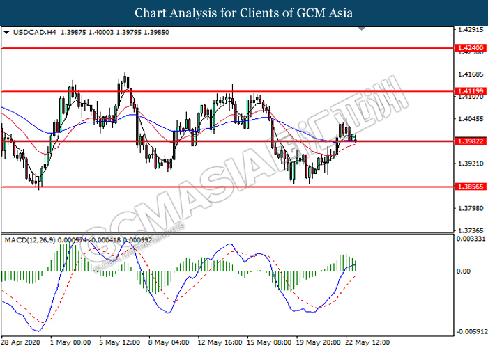 USDCAD, H4: USDCAD was traded lower while currently testing the support level at 1.3980. MACD which illustrates diminishing bullish momentum suggest the pair to extend its losses after it successfully breakout below the support level.