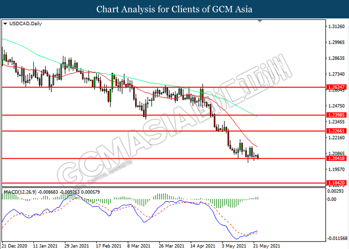 USDCAD, Daily: USDCAD was traded lower while currently testing the support level at 1.2040. However, MACD which illustrated increasing bullish momentum suggest the pair to be traded higher in short-term amid technical correction.