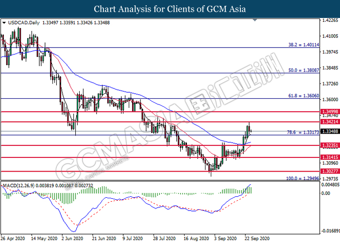 USDCAD, Daily: USDCAD was traded lower following prior retracement from the resistance level at 1.3420. MACD which illustrate diminishing bullish momentum suggest the pair to extend its losses toward the support level at 1.3315.