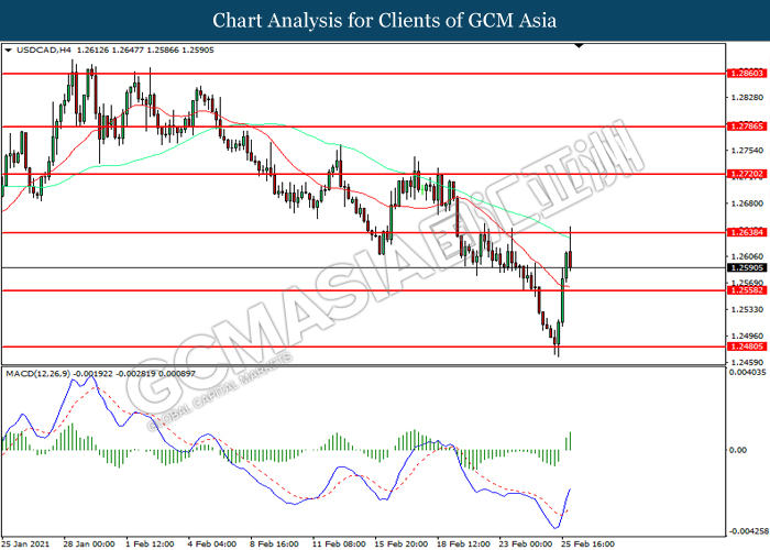USDCAD, H4: USDCAD was traded lower following prior retracement from the resistance level at 1.2640. However, MACD which illustrated increasing bullish momentum suggest the pair to be traded higher in short-term as technical correction.
