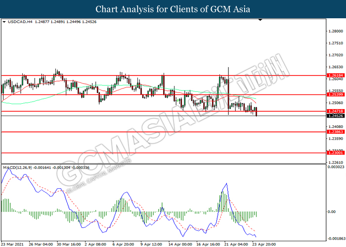 USDCAD, H4: USDCAD was traded lower following prior breakout below the previous support level at 1.2470. MACD which illustrated increasing bearish momentum suggest the pair to extend its losses toward support level at 1.2385.