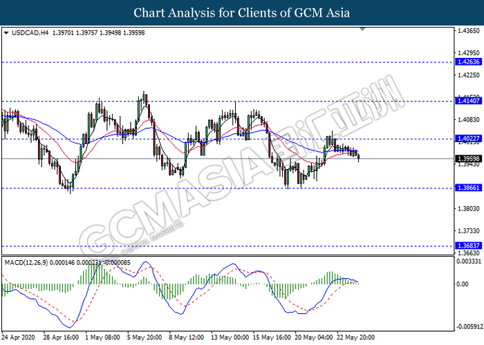 USDCAD, H4: USDCAD was traded lower following prior retracement from the resistance level 1.4020. MACD which illustrate diminishing bullish momentum signal with the starting formation of death cross suggest the pair to extend its retracement towards the support level 1.3860.