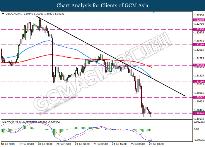 USDCAD, H1: USDCAD was traded lower while currently testing the support level 1.3030. Recent price and MACD showing diminished bearish momentum with starting formation of a golden cross suggest the pair may be traded higher as a short term technical correction towards the resistance level 1.3075 before resume its major trend.