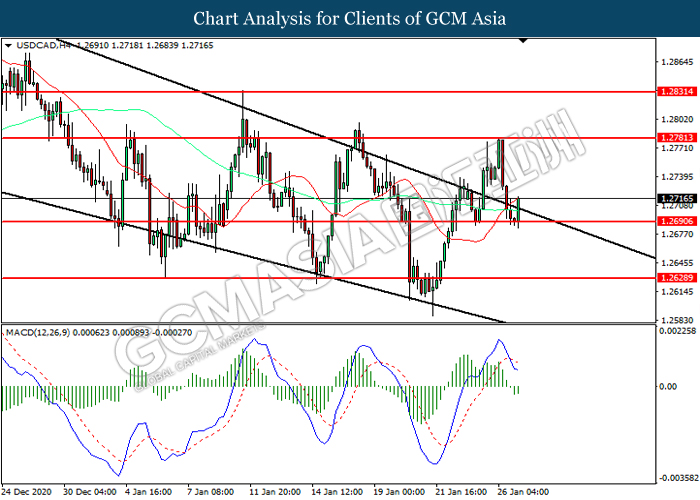 USDCAD, H4: USDCAD was traded higher following prior rebound from the support level at 1.2690. MACD which illustrated diminishing bearish momentum suggest the pair to extend its gains toward resistance level at 1.2780.