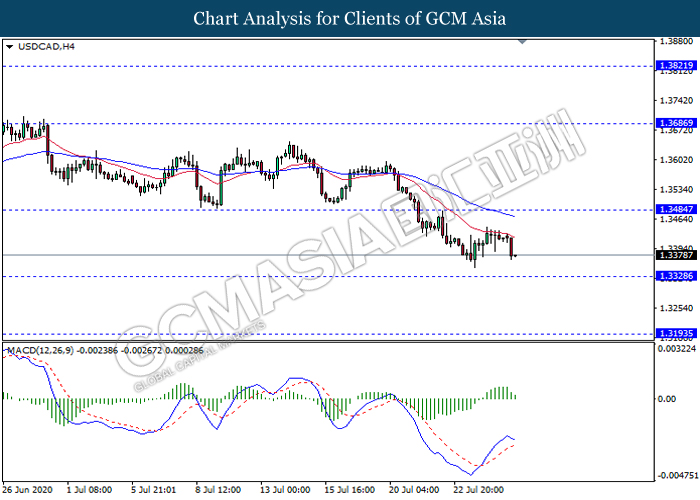 USDCAD, H4: USDCAD was traded lower while currently testing near the support level 1.3330. MACD which illustrate diminishing bullish momentum signal suggest the pair to extend its losses after it breaks below the support level.