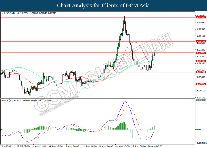 USDCAD, H4: USDCAD was traded higher while currently testing the resistance level at 1.2705. MACD which illustrated increasing bullish momentum suggest the pair to extend its gains after it successfully breakout above the resistance level.