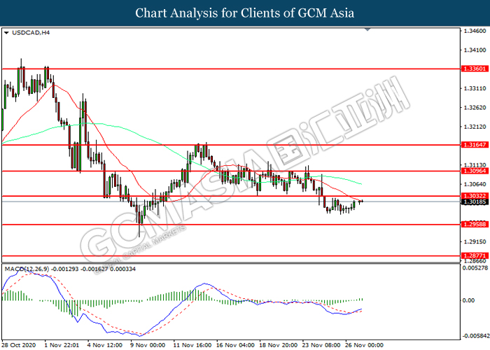 USDCAD, H4: USDCAD was traded higher while currently testing the resistance level at 1.3030. MACD which illustrated increasing bullish momentum suggest the pair to extend its gains after it successfully breakout above the resistance level.