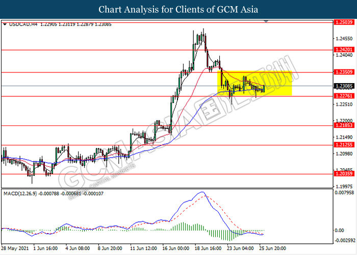 USDCAD, H4: USDCAD remain traded in a sideway channel following recent rebound from the support level 1.2275. However, MACD illustrate diminishing bearish momentum signal with the starting formation of golden cross suggest the pair to be traded higher towards the resistance level 1.2350.