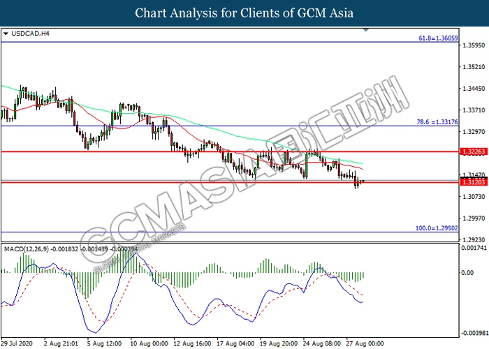 USDCAD, H4: USDCAD was traded lower while currently testing the support level at 1.3120. However, MACD which illustrated diminishing bearish momentum suggest the pair to be traded higher in short-term as technical correction.