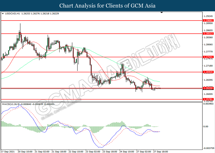 USDCAD, H1: USDCAD was traded lower while currently near the support level at 1.2625. However, MACD which illustrated diminishing bearish momentum suggest the pair to be traded higher in short-term as technical correction.