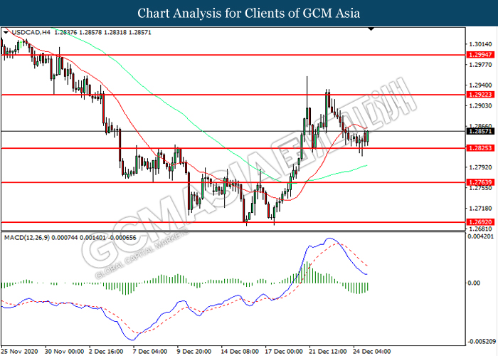 USDCAD, H4: USDCAD was traded higher following prior rebound from the support level at 1.2825. MACD which illustrated diminishing bearish momentum suggest the pair to extend its gains toward resistance level at 1.2920.