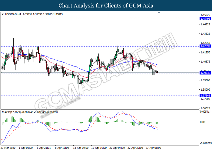 USDCAD, H4: USDCAD was traded lower while currently testing the support level 1.3975. However, MACD which illustrate diminishing bearish momentum signal suggest the pair to experience a technical correction towards the resistance level 1.4260.