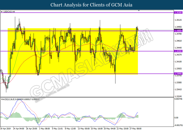 USDCAD, H4: USDCAD was traded higher while currently testing the top-level of its sideway channel. MACD which illustrate bullish momentum suggest the pair to extend its gains after successfully closing above the top-level of the channel.