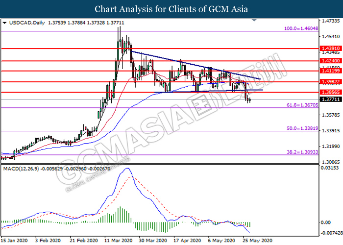 USDCAD, Daily: USDCAD was traded lower following prior breakout below the previous support level at 1.3855. MACD which illustrates bearish bias momentum suggest the pair to extend its losses toward the support level at 1.3670.