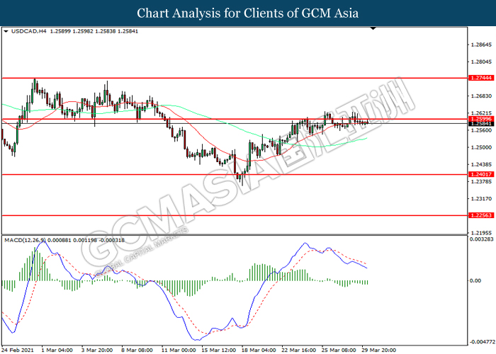 USDCAD, H4: USDCAD was traded higher while currently testing the resistance level at 1.2600. However, MACD which illustrated increasing bearish momentum suggest the pair to be traded lower in short-term as technical correction.