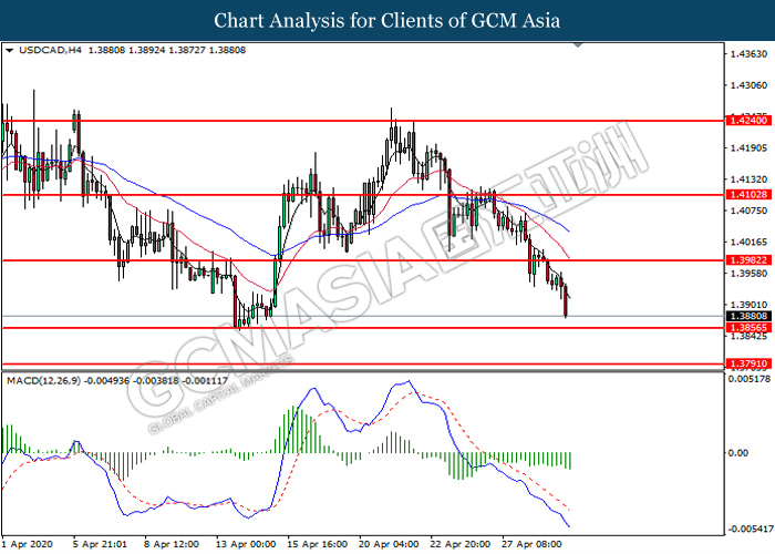 USDCAD, H4: USDCAD was traded lower following prior breakout below the previous support level at 1.3980. MACD which illustrate bearish bias momentum suggests the pair to extend its losses toward the support level at 1.3855.