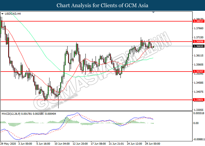 USDCAD, H4: USDCAD was traded lower following prior retracement from the resistance level at 1.3690. MACD which illustrated increasing bearish momentum suggest the pair to extend its losses toward support level at 1.3520.
