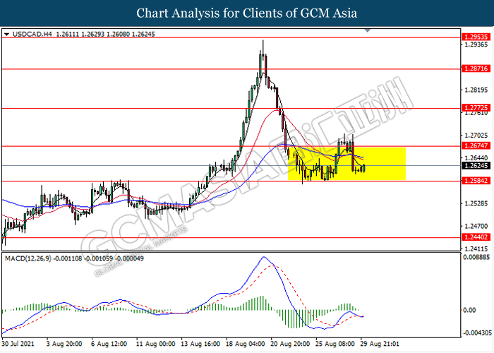 USDCAD, H4: USDCAD remain traded in a sideway channel while currently testing near the support level 1.2585. However, MACD which illustrate bearish bias signal suggest the pair to be traded lower following prior breakout below the support level.