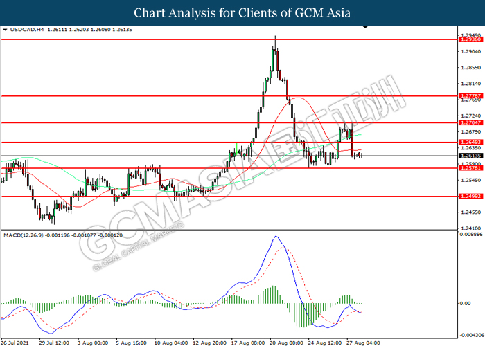 USDCAD, H4: USDCAD was traded lower while currently near the support level at 1.2580. MACD which illustrated diminishing bullish momentum suggest the pair to extend its losses after it successfully breakout below the support level.
