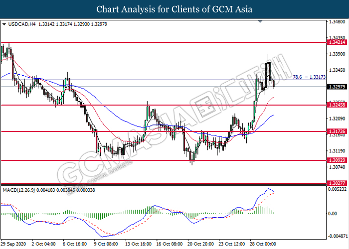 USDCAD, H4: USDCAD was traded lower following prior breakout below the previous support level at 1.3315. MACD which illustrate diminishing bullish momentum signal suggest the pair to extend its losses toward the support level at 1.3245.