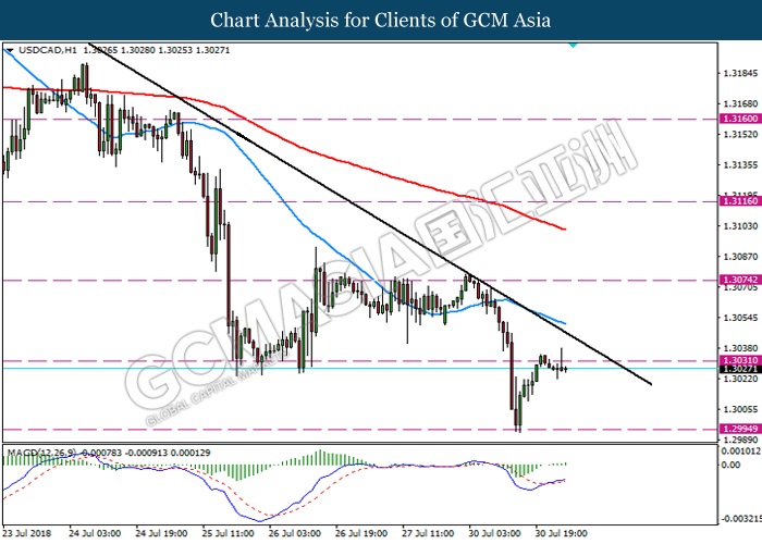 USDCAD, H1: USDCAD was traded higher following prior rebound from the support level 1.2995 and currently testing the resistance level 1.3030. Although recent price action and MACD display bullish signals with golden cross formation and also positive divergence, however a breakout above the resistance level 1.3030 and trend line are required for further confirmation.