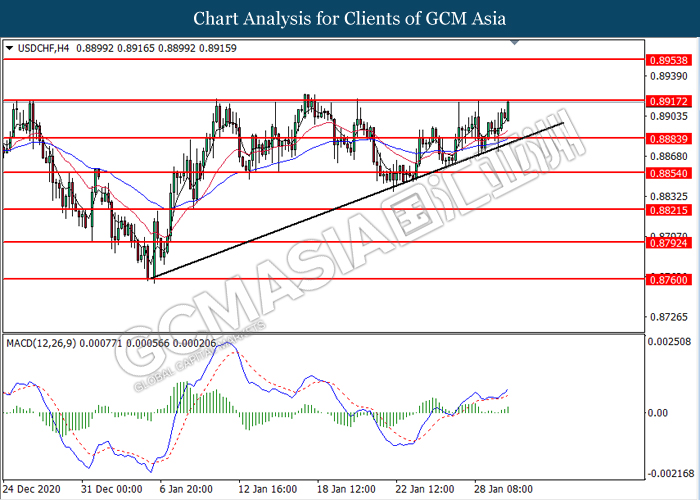 USDCHF, H4: USDCHF was traded higher while currently testing the resistance level at 0.8915. MACD which illustrated bullish bias momentum suggest the pair to extend its gains after it successfully breakout above the resistance level at 0.8915.