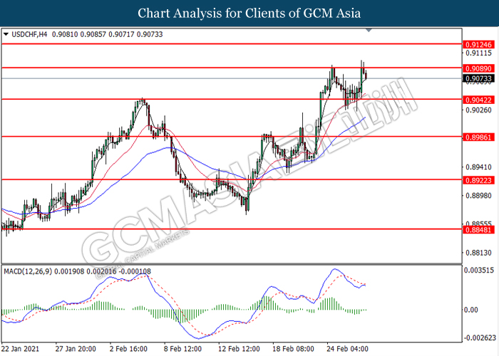 USDCHF, H4: USDCHF was traded lower following prior retracement from the resistance level at 0.9090. However, MACD which illustrated diminishing bearish momentum suggest the pair to undergo technical correction.