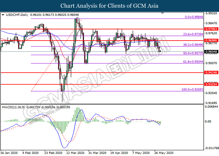 USDCHF, Daily: USDCHF was traded lower following prior breakout below the previous support level at 0.9650. MACD which illustrates bearish bias momentum signal suggest the pair to extend its losses toward the support level at 0.9575.