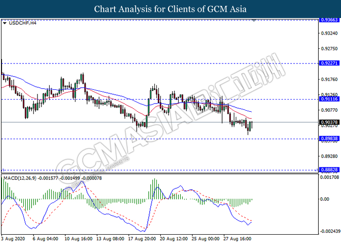 USDCHF, H4: USDCHF was traded lower while currently testing near the support level 0.8985. However, MACD which illustrate diminishing bearish momentum signal suggest the pair to experience a technical correction towards the resistance level 0.9110.
