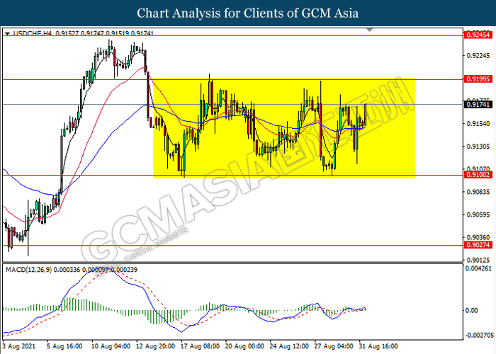 USDCHF, H4: USDCHF remain traded in sideway channel following recent rebound from its low level. However, MACD which illustrate bullish momentum signal suggest the pair to extend its rebound towards the resistance level 0.9200.