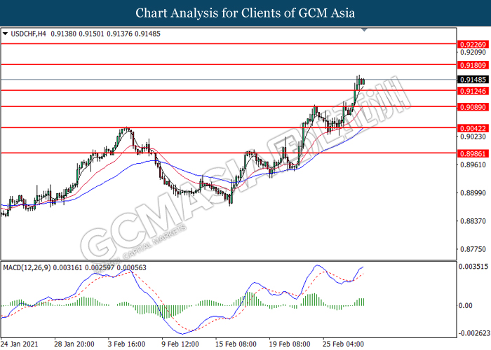 USDCHF, H4: USDCHF was traded higher following prior breakout above the previous resistance level at 0.9125. MACD which illustrated bullish bias momentum suggest the pair to extend its gains toward the resistance level at 0.9180.
