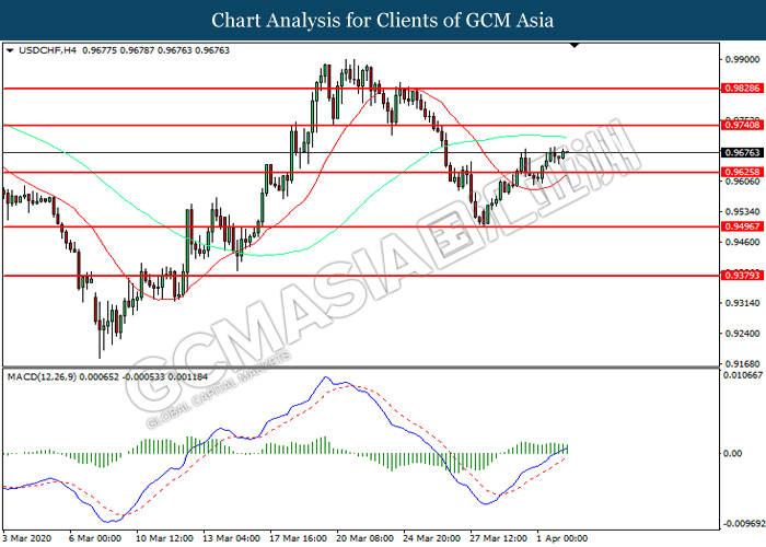 USDCHF, H4: USDCHF was traded higher following prior rebound from the support level at 0.9625. However, MACD which illustrated diminishing bullish momentum suggest the pair to be traded lower in short-term as technical correction.
