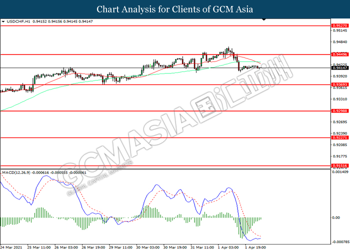 USDCHF, H1: USDCHF was traded lower following prior retracement from the resistance level at 0.9450. However, MACD which illustrated diminishing bearish momentum suggest the pair to be traded higher in short-term as technical correction.