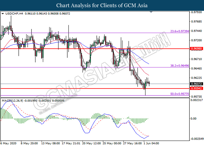 USDCHF, H4: USDCHF was traded higher following prior rebound from the support level at 0.9595. MACD which illustrates diminishing bearish momentum signal suggest the pair to extend its gains toward the resistance level at 0.9650.